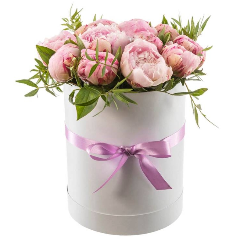 Букет состоит из 17 розовых пионов, зелень, коробка, атласная лента, оазис.